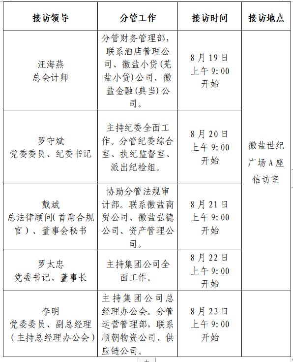 根據(jù)工作安排,現(xiàn)就省生態(tài)環(huán)境集團(tuán)領(lǐng)導(dǎo)班子成員8月份接待群眾來訪安排公示如下: